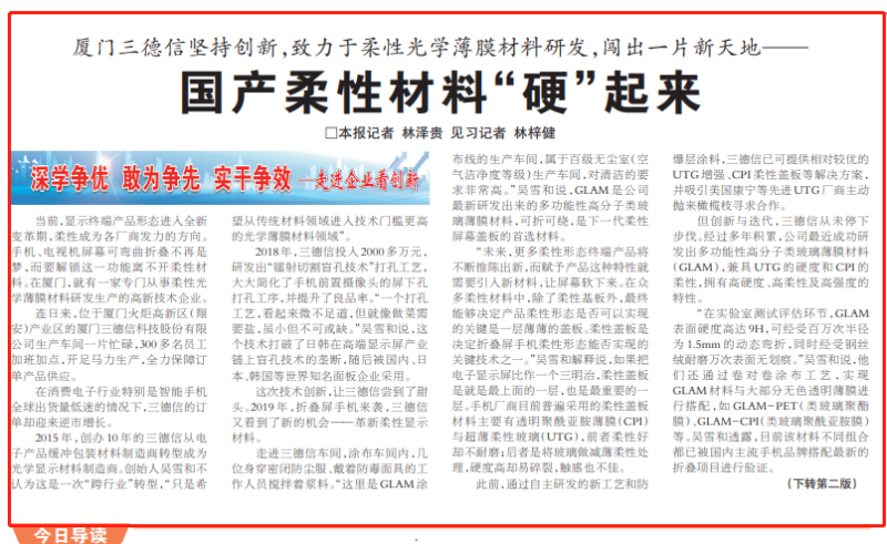 为大力宣传中国制造“隐形冠军”,推广隐形冠军企业的奋斗历程、成功经验和发展模式,引导制造业高质量发展,《福建日报》与【好博在线官网】联合陆续推出“隐形冠军”专题报道。以下是专题报道第一篇厦门三德信(协会会员企业)的宣传报道,《国产柔性材料“硬”起来——厦门三德信坚持创新,致力于柔性光学薄膜材料研发,闯出一片新天地》,刊发于今日《福建日报》头版。
